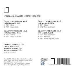Le flûtiste italien Gabriele Formenti mène ce projet d’enregistrement sur instruments d’époque en présentant une interprétation rafraîchissante des chefs-d’œuvre de Mozart avec ses partenaires de musique de chambre. Malgré la grande notoriété de ce répertoire mozartien, il y a peu d’enregistrements sur instruments originaux publiés ces derniers temps, cet album se veut une contribution en présentant une interprétation qui a beaucoup été travaillé sur la qualité du son et des articulations originales.